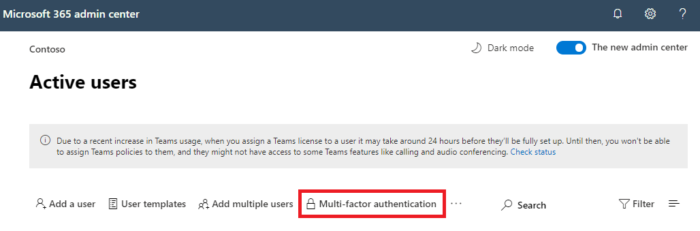 - 导航至 Users 用户 部分,选择 Active users 活跃用户,然后单击 Multi-factor authentication多重身份验证。