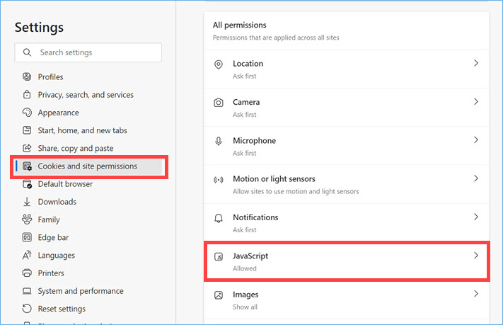 - 对于所有站点 – 转到设置页面 edge://设置/内容/javascript 并删除被阻止的网站。