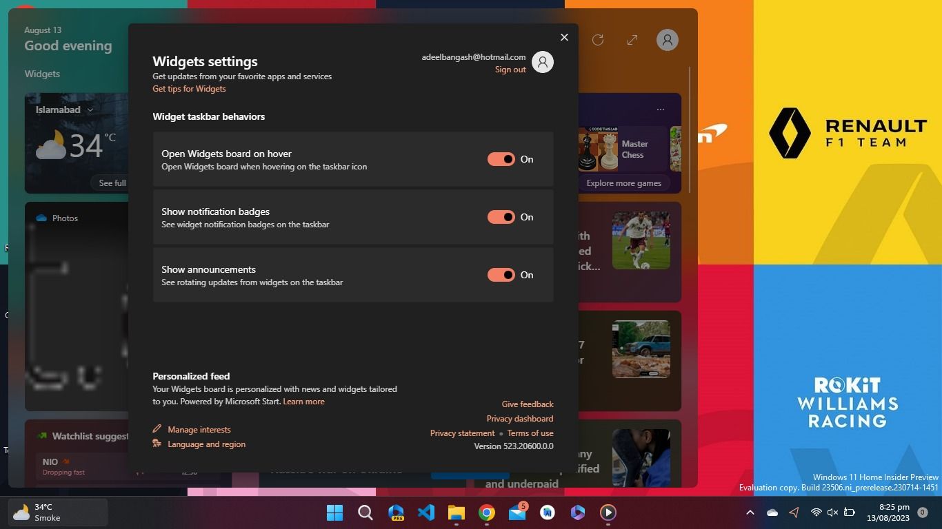 您可以通过任务栏上的小部件面板图标(由白色和蓝色方块表示)或按键盘快捷键开始使用小部件 窗口+W。 设置好小部件后,您可以根据您的兴趣对小部件进行个性化设置,并根据您的偏好进行排列。