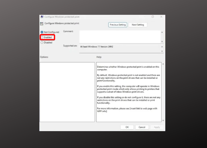 现在,将其设置为 启用 启用 Windows 保护打印模式。