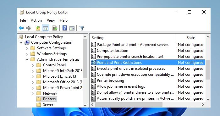 组策略是 Windows 操作系统中的一个强大工具,可帮助组织管理和控制其联网计算机的各种设置和配置。 它有各种控制您的计算机的策略。 我们将配置 指向和打印限制 政策来解决问题。 按照规定的步骤执行相同的操作。