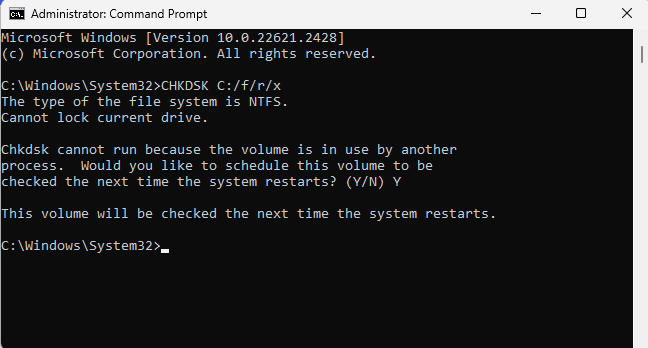 - 如果您的根驱动器正在使用,该命令将不会开始运行。 但是,当您重新启动电脑时,它会要求您开始扫描。
