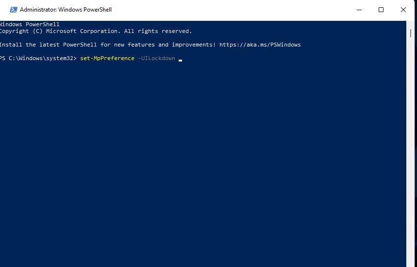 运行 set-MpPreference PowerShell 命令是广泛确认的“页面不可用”错误的潜在解决方案。 已确认的命令禁用 Microsoft Defender 的 UI 锁定模式。 您可以像这样运行该 PowerShell 命令: