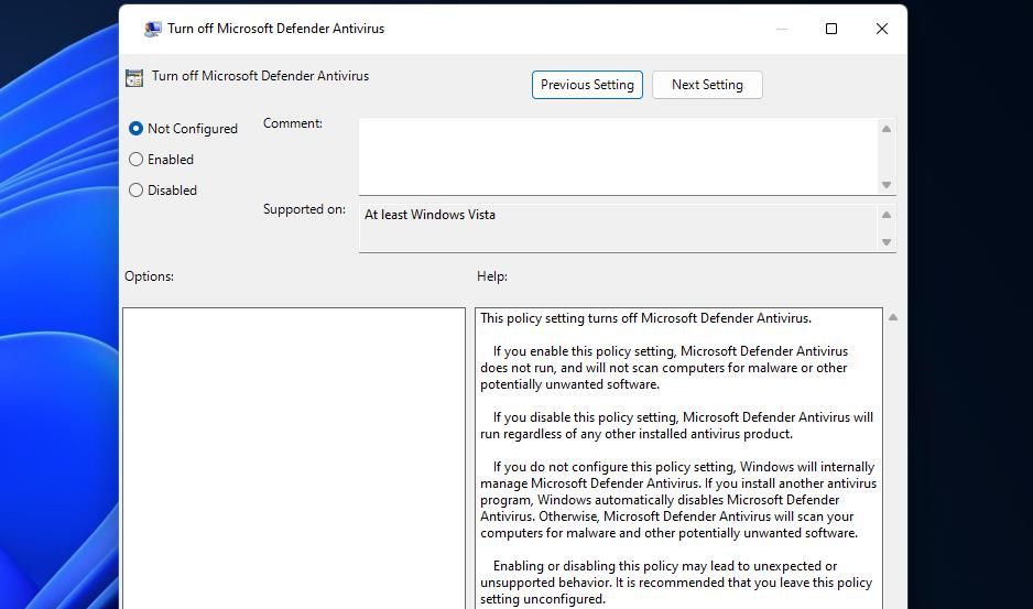 一些 Windows 专业版和企业版用户已确认他们已通过禁用 关闭 Microsoft Defender 防病毒软件 政策。 因此,即使您不记得自己更改过该策略设置,也要检查它。 这是您可以检查和禁用的方法 关闭 Microsoft Defender 防病毒软件 Windows Pro 和 Enterprise 中的组策略设置: