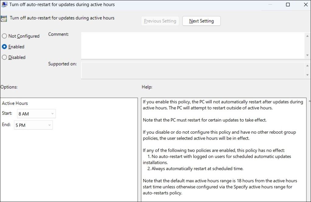 使用上述方法之一设置活动时间后,Windows 将避免在指定时间段内为更新启动自动重启。 因此,您不会在工作时间被突然重启打扰。