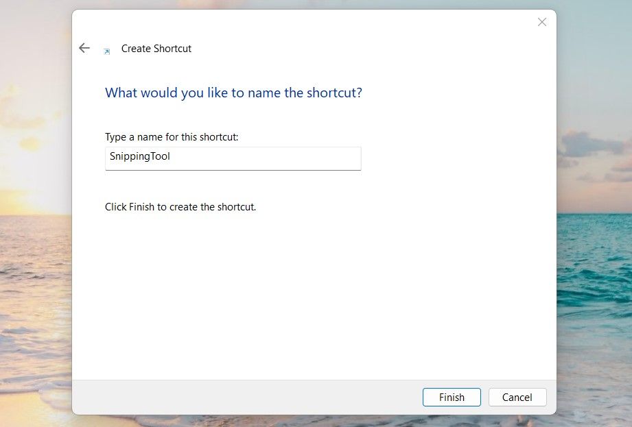 - 为您的快捷方式输入一个名称(例如“截图工具”),然后单击 结束.