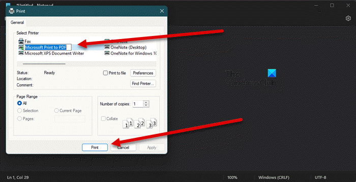 Windows 内置 PDF 打印机允许您将任何内容创建为 PDF。此工具可以将记事本中编写的简单文本转换为 PDF。您可以尝试打印文档,进入应用程序后,只需选择所需选项,您的文档就会以 PDF 格式保存。