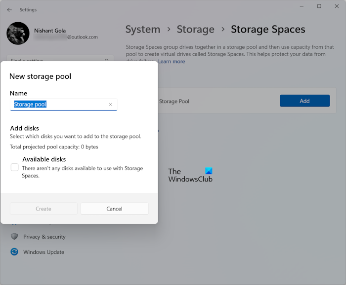 - 确保两个硬盘都连接到您的系统。 输入您的存储池的名称。 Windows 将自动检测并显示连接的硬盘。