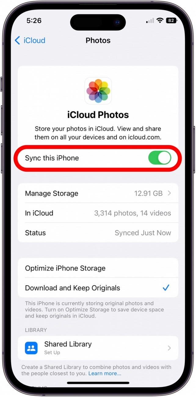 - 对于安装了 iOS 17 或 iOS 16 的 iPhone,请切换到同步此 iPhone。 (对于较旧的软件版本,请切换到 iCloud 照片。)