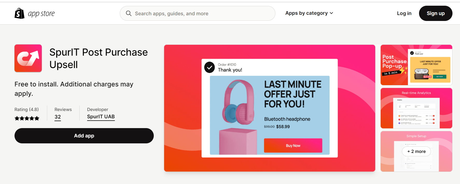 SpurIT 是一款免费安装的售后追加销售应用程序,您可以使用它来促进商店的增长。 它利用感谢页面来提高您的平均订单价值和转化率。