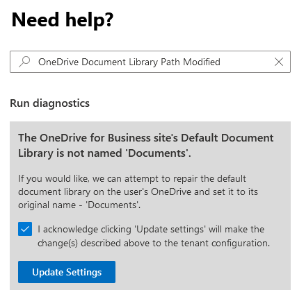 点击 运行测试:OneDrive 文档库路径已修改。 这将填充 Microsoft 365 管理中心中的诊断。